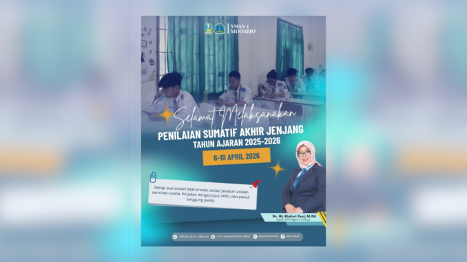 Sidoarjo, 6 April 2026 – SMA Negeri 2 Sidoarjo melaksanakan Penilaian Sumatif Akhir Jenjang (PSAJ) Tahun Ajaran 2025/2026 bagi siswa kelas XII pada 6 hingga 10 April 2026. Kegiatan ini menjadi tahap akhir evaluasi pembelajaran siswa sebelum menyelesaikan pendidikan di tingkat SMA.